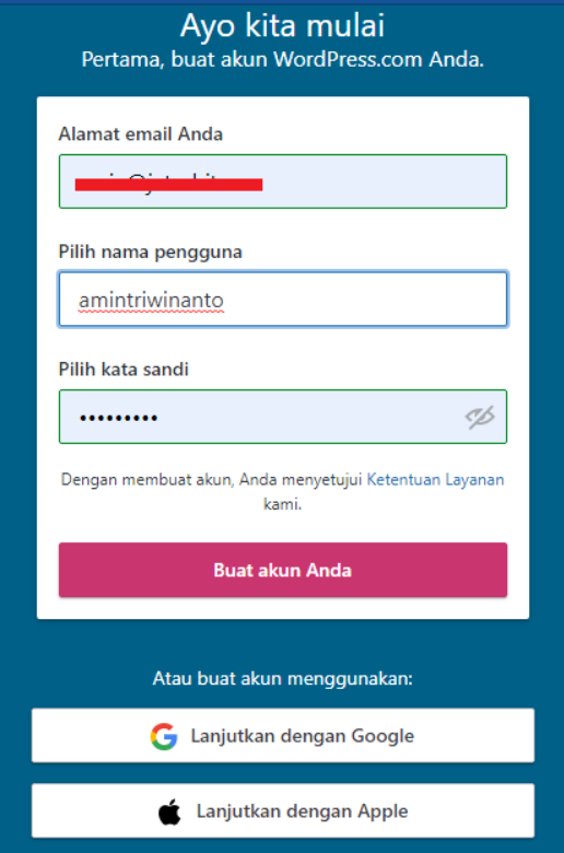 Anda bisa menggunakan akun Google atau Apple yang sudah ada dengan klik " lanjutkan dengan " pada bagian bawah setelah itu klik Buat akun.
